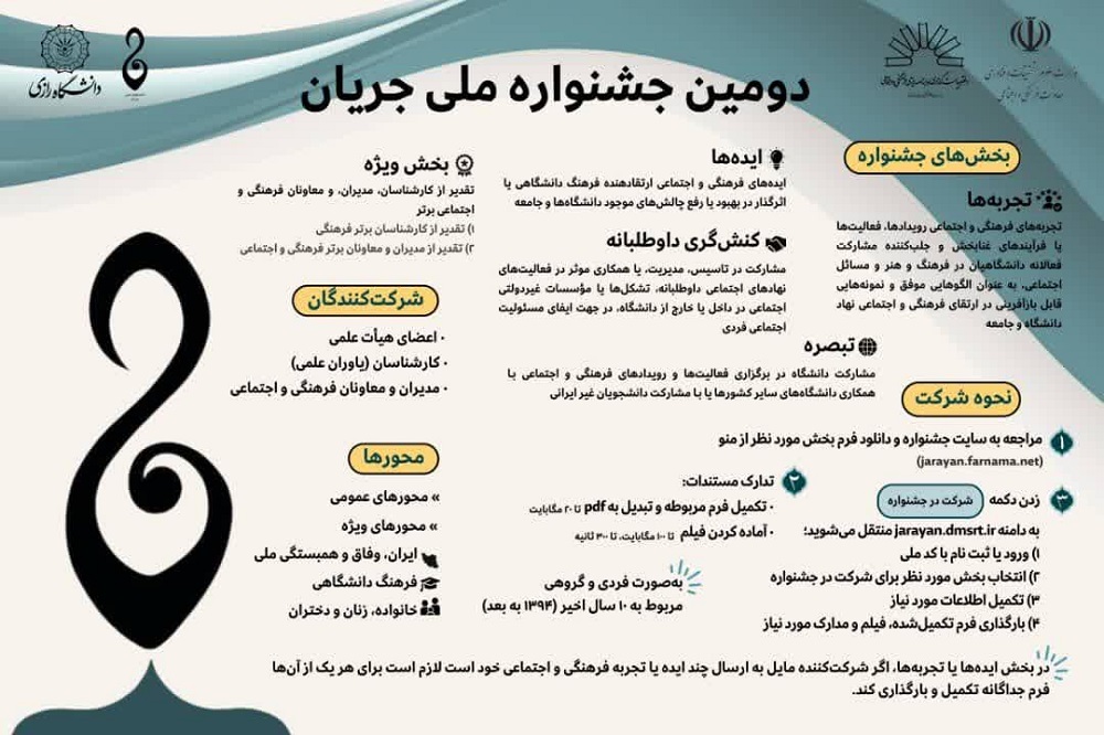 دفتر سیاست‌گذاری و برنامه‌ریزی فرهنگی و اجتماعی وزارت علوم، تحقیقات و فناوری به میزبانی دانشگاه رازی برگزار می‌کند: دومین جشنواره ملی جریان (شناسایی و به اشتراک‌گذاری ایده‌ها و تجربه‌های موفق فرهنگی و اجتماعی دانشگاه‌ها).