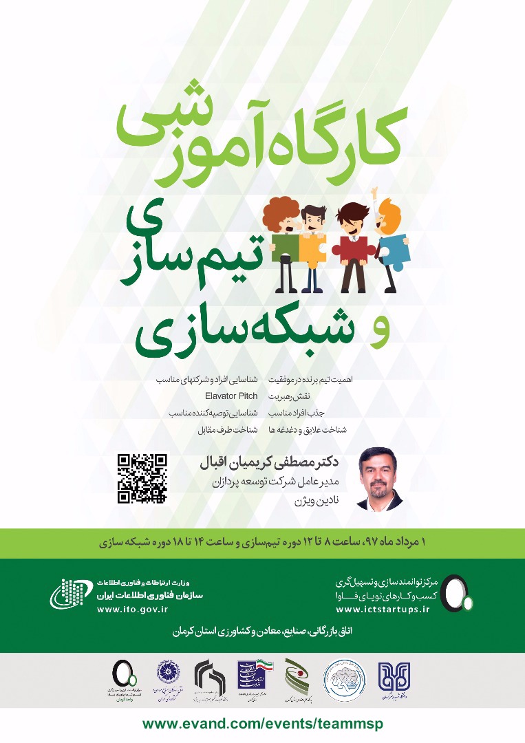 به گزارش روابط عمومی پارک علم و فناوری استان کرمان، دکتر کریمیان اقبال مشاور دفتر سیاست گذاری و برنامه ریزی امور فناوری وزارت علوم و از بنیان گذاران پارکهای علم و فناوری در ایران برای برگزاری یک دوره آموزشی یک روزه در تاریخ 1مرداد1397با عنوان تیم سازی و شبکه سازی با همکاری پارک علم و فناوری استان کرمان و اتاق بازرگانی به کرمان می آید و از مهمترین ویژگیهای این کارگاه آموزشی این است که یاد میگیریم چگونه یک تیم فوق العاده قوي داشته باشیم، چکار کنیم افراد تیم به بهترین نحو با هم ارتباط داشته باشند،