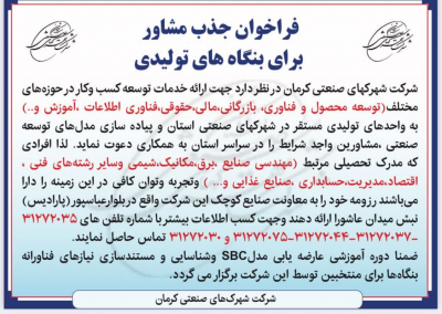 شرکت شهرک‌های صنعتی کرمان در نظر دارد جهت ارائه توسعه کسب‌وکار در حوزه‌های مختلف (توسعه محصول و فناوری، بازرگانی، مالی، حقوقی، فناوری اطلاعات، آموزش، و...) به واحدهای تولیدی مستقر در شهرک‌های صنعتی استان و پیاده‌سازی مدل‌های توسعه صنعتی، مشاورین واجد شرایط را در سراسر استان به همکاری دعوت کند؛ لذا افرادی که مدرک تحصیلی مرتبط (مهندسی صنایع، برق، مکانیک، شیمی، و سایر رشته‌های فنی، اقتصاد، مدیریت، حسابداری، صنایع غذایی، و...) و تجربه و توان کافی در این زمینه را دارا هستند، می‌توانند رزومه خود را به معاونت صنایع کوچک این شرکت واقع در بلوار شهید عباسپور (پارادیس) نبش میدان عاشورا ارائه دهند و جهت کسب اطلاعات بیشتر با شماره ‌تلفن‌های 31272035-31272037-31272044-31272075-31272030 تماس حاصل نمایند.