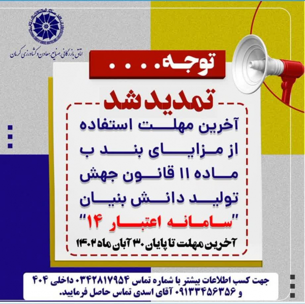 به گزارش روابط عمومی پارک علم و فناوری،مهلت استفاده از مزایای بند ب ماده 11 قانون جهش تولید دانش بنیان(سامانه اعتبار 14) تمدید شده و مهلت آن تا 30 آبان ماه 1402 است.