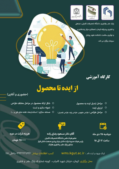 پارک علم و فناوری دانشگاه تحصیلات تکمیلی صنعتی و فناوری پیشرفته کرمان با همکاری مرکز رشد فناوری و نوآوری سلامت دانشگاه علوم پزشکی سیرجان کارگاه آموزشی " از ایده تا محصول" را در تاریخ دوشنبه ۲۵ دی ماه ساعت ۱۲ الی ۱۵ برگزار می‌کند.