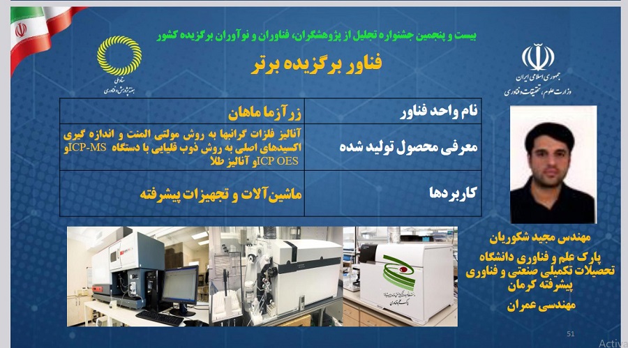 در بیست‌وپنجمین جشنواره تجلیل از پژوهشگران و فناوران برگزیده کشوری  از مجید شکوریان از شرکت "زرآزماماهان" از شرکت های پارک علم و فناوری دانشگاه تحصیلات تکمیلی صنعتی و فناوری پیشرفته (هایتک) کرمان به عنوان فناور برتر کشوری با حضور دکتر حسین سیمایی وزیر علوم، دکتر پیمان صالحی معاون پژوهشی وزیر و رئیس ستاد ملی هفته پژوهش و فناوری، دکتر محمدنبی شهیکی‌ معاون فناوری و نوآوری وزارت علوم، تعدادی از روسای دانشگاه‌ها، پژوهشگاه‌ها و پارک‌های علم و فناوری کشور تجلیل شد.