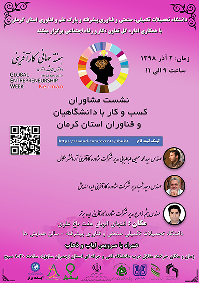 گروه ارتباط با صنعت دانشگاه تحصیلات تکمیلی صنعتی و فناوری پیشرفته با همکاری اداره تعاون، کار و رفاه اجتماعی و پارک علم و فناوری استان کرمان در روز پایانی هفته جهانی کارآفرینی اقدام به برگزاری نشست مشاوران کسبوکار با دانشگاهیان و فناوران استان کرمان نموده است.