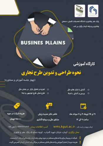 به گزارش روابط عمومی پارک علم و فناوری، کارگاه آموزشی «نحوه طراحی و تدوین طرح تجاری» در چهار جلسه، آموزشی و مشاوره به همت پارک علم و فناوری دانشگاه تحصیلات تکمیلی صنعتی و فناوری پیشرفته کرمان برگزار می‌شود.