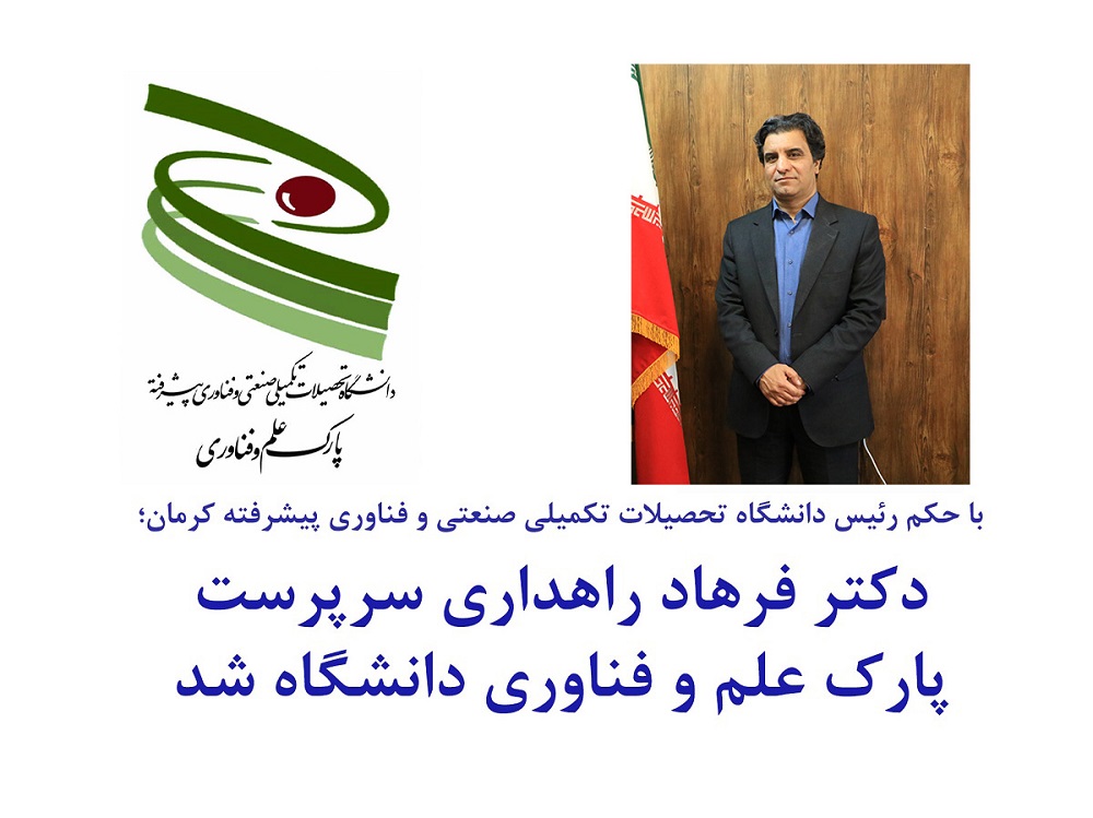 دكتر فرهاد راهداري با صدور حکم از سوی دکتر حسین محبی رئیس دانشگاه تحصیلات تکمیلی صنعتی و فناوری پیشرفته به عنوان سرپرست پارك علم و فناوري دانشگاه منصوب  شد.