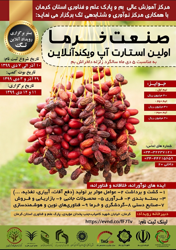استارتاپ ویکند حوزه صنعت خرما مرکز آموزش عالی بم و پارک علم و فناوری کرمان با همکاری مرکز نوآوری و شتاب دهی تگ برگزار می کند.