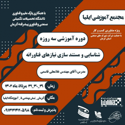 به گزارش روابط عمومی پارک علم و فناوری، مجتمع آموزشی «ایلیا» با همکاری پارک علم و فناوری دانشگاه تحصیلات تکمیلی صنعتی و فناوری پیشرفته کرمان و حمایت شرکت شهرک‌های صنعتی استان کرمان، دوره آموزشی سه روزه «شناسایی و مستندسازی نیازهای فناورانه» را برگزار می‌کند.