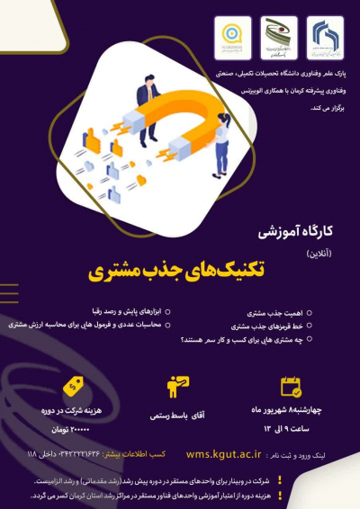 پارک علم و فناوری دانشگاه تحصیلات تکمیلی صنعتی و فناوری پیشرفته کرمان، وبینار آموزشی " تکنیک های جذب مشتری " را در تاریخ ۸ شهریورماه برگزار می‌کند.