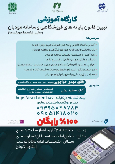 سازمان نظام صنفی رایانه‌ای کرمان با همکاری سازمان امور مالیاتی، کارگاه آموزشی «تبین قانون پایانه‌های فروشگاهی و سامانه مودیان» را در تاریخ پنج‌شنبه 4 آبان‌ماه 1402 در سالن اجتماعات اداره مخابرات سیدالشهدا کرمان برگزار می‌کند.