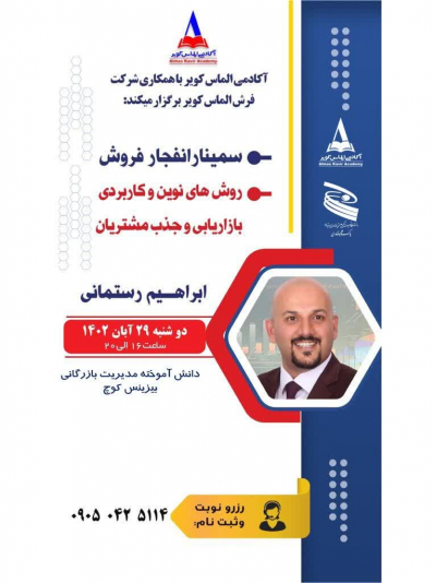 آکادمی الماس کویر با همکاری پارک علم و فناوری دانشگاه تحصیلات تکمیلی صنعتی و فناوری پیشرفته کرمان سمینار "انفجار فروش، روش‌های نوین و کاربردی بازاریابی و جذب مشتریان" را در تاریخ دوشنبه ۲۹ آبان ماه از ساعت ۱۶ الی ۲٠ برگزار می‌کند.