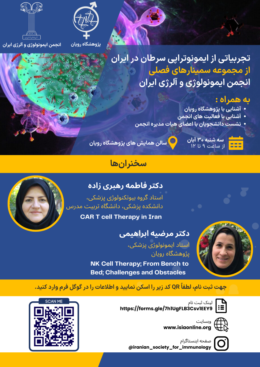 سمینار علمی با موضوع تجربیاتی از ایمونوتراپی سرطان در ایران در روز سه‌شنبه ۳۰ آبان ۱۴۰۲ به‌صورت حضوری و آنلاین در سالن همایش‌های |پژوهشگاه رویان ایران برگزار می‌شود.