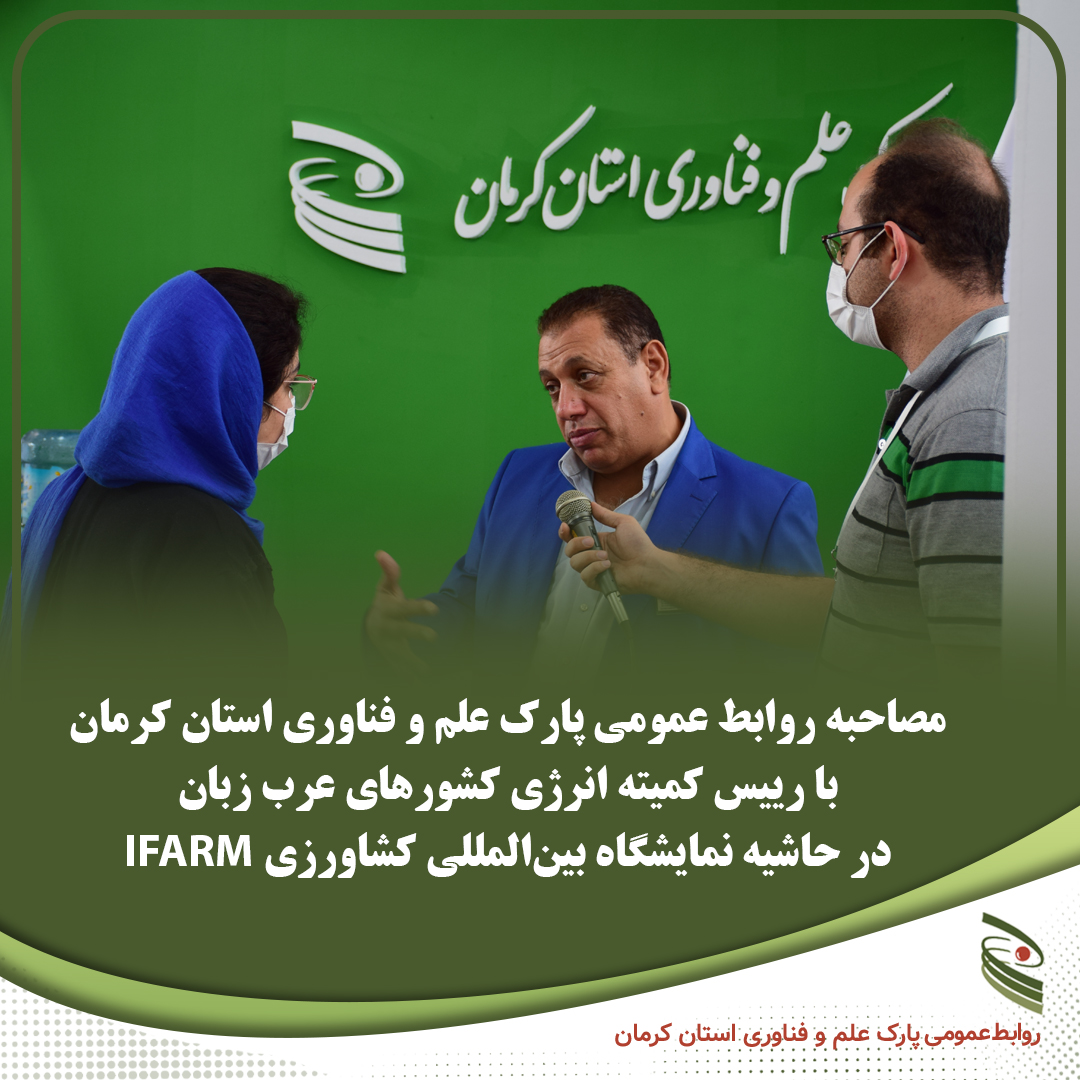 ![]() مصاحبه روابط عمومی پارک علم و فناوری استان کرمان با رییس کمیته انرژی کشورهای عربزبان در حاشیه چهارمین نمایشگاه بینالمللی کشاورزی IFARM تهران در حاشیه چهارمین نمایشگاه بینالمللی کشاورزی IFARM تهران رییس کمیته انرژی کشورهای عربزبان پس از بازدید از غرفه پارک علم و فناوری استان کرمان، ضمن مقایسه شرکتهای حاضر از لحاظ کیفی با رقیبان اروپایی خود به گفتگو با روابط عمومی پارک پرداخت. | |