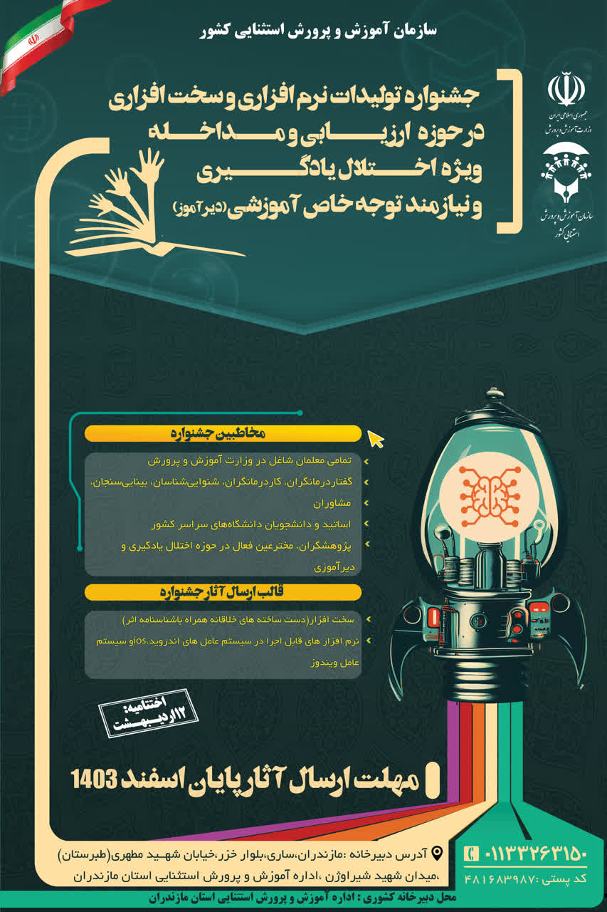 جشنواره تولیدات نرم افزاری وسخت افزاری (دست ساخته‌های معلمان ومتخصصان) در راستای ارتقاء کیفیت ارائه خدمات تشخیصی، توانبخشی وآموزشی به دانش آموزان گروه هدف توسط سازمان آموزش وپرورش استثنایی در سال تحصیلی ۱۴۰۴-۱۴۰۳ برگزار می شود.